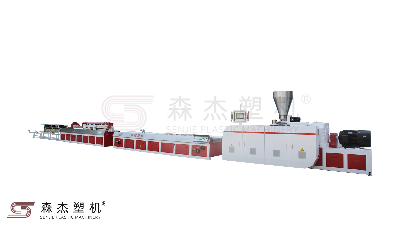 該機(jī)組混煉塑化效果好,擠出壓力穩(wěn)定,產(chǎn)量高,節(jié)能降耗,可適應(yīng)高填充量的木粉和其它植物纖維。主要用于包裝箱板、欄板、步道、戶外桌椅、托盤,底板等裝飾材料,用途十分廣泛。